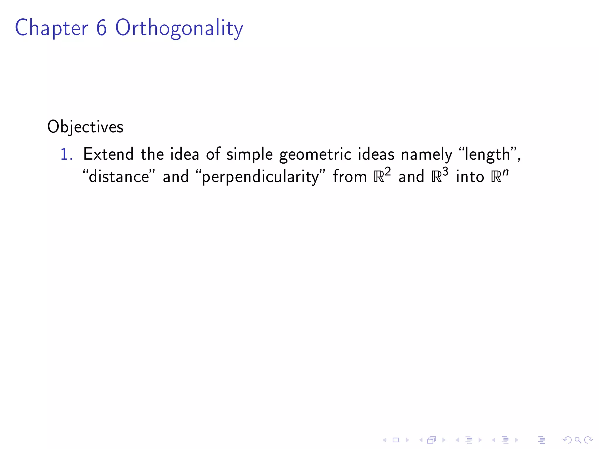 - Chapter 6 objectives include extending geometric concepts like length, distance, and perpendicularity to Rn. These concepts are useful for least squares fitting of experimental data to a system of equations.