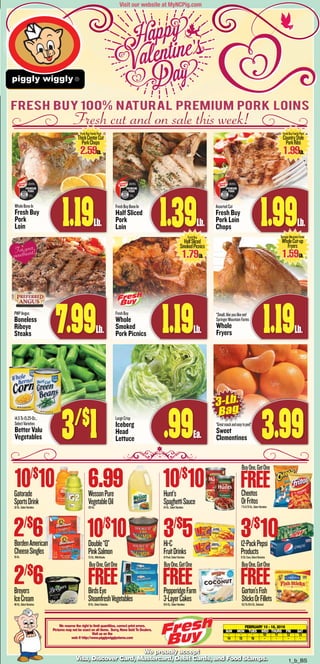 This document appears to be a grocery store advertisement listing various products and their prices. It includes sections for produce, meat, dairy, frozen foods, snacks, beverages, and household items. Many items are on sale or buy-one-get-one offers. The ad lists the store locations and hours.
