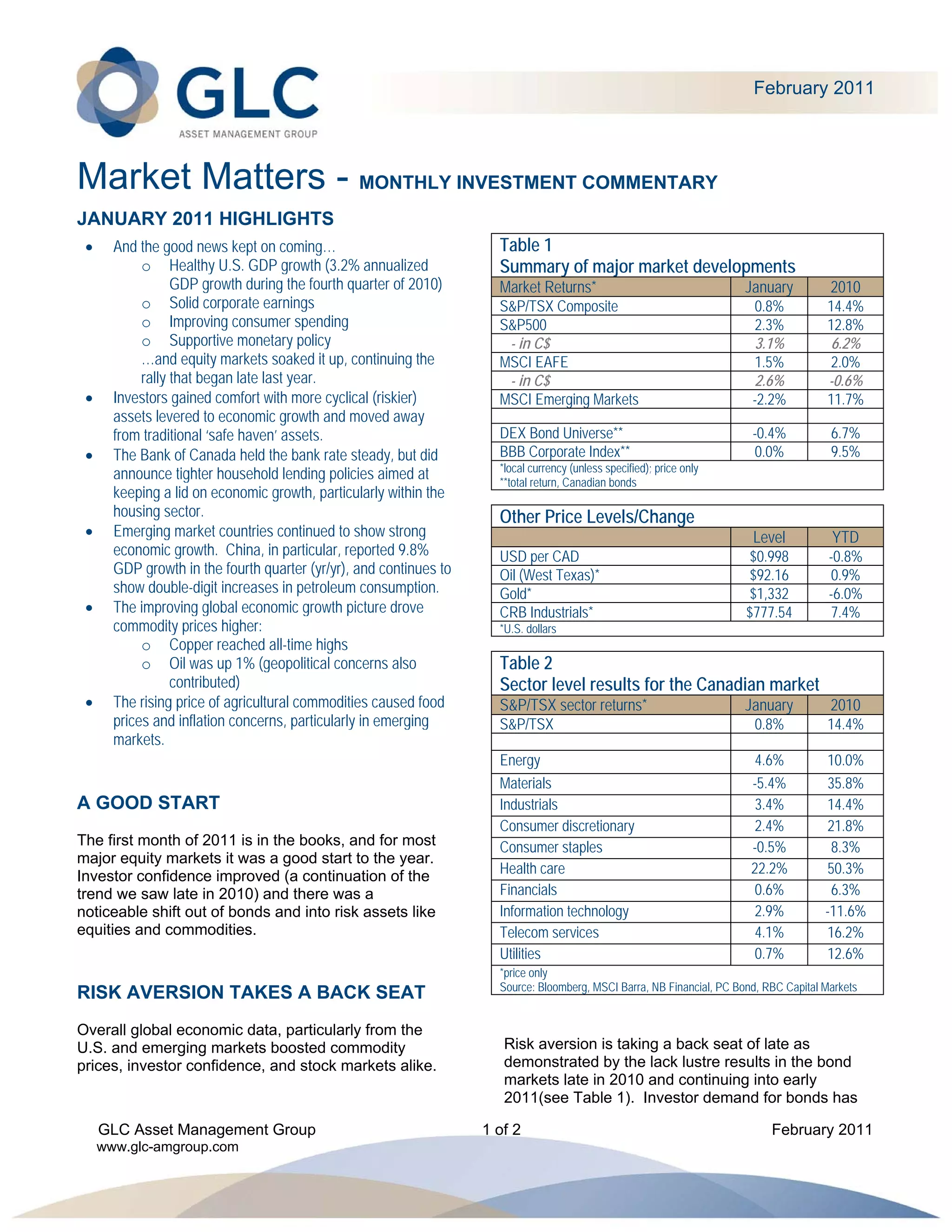 - Major stock markets started 2011 positively, continuing the rally from late 2010, as improving economic data boosted investor confidence.
