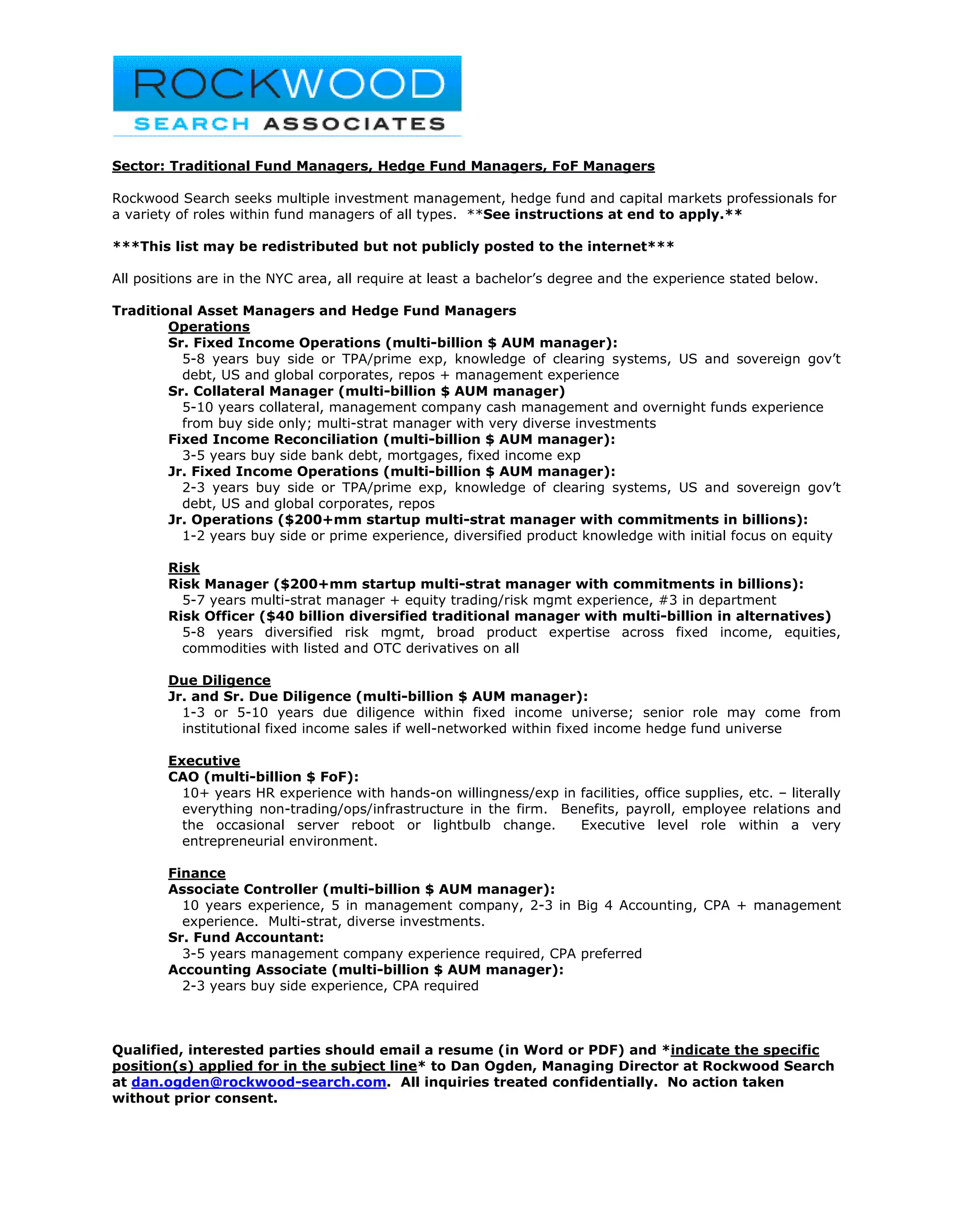Rockwood Search is seeking investment management professionals for various roles in traditional fund management and hedge fund sectors, based in the NYC area. Positions require varying levels of experience in fixed income operations, risk management, due diligence, and accounting, with specific requirements for each role. Interested applicants must email their resumes, indicating the desired position, to the managing director at Rockwood Search.