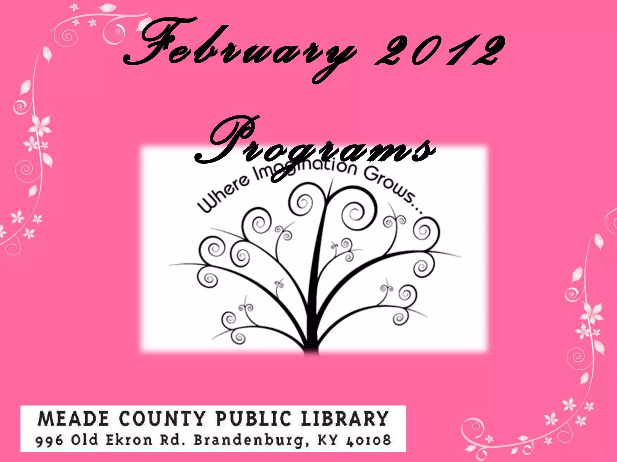 The document provides information about programs and services offered by the Meade County Public Library in February 2012. It lists a variety of adult programs including computer classes, exercise classes like Zumba and yoga, art classes, book clubs, music events, and workshops. It also announces programs for preschoolers, families, tweens, teens, and high school students, including storytimes, crafts, movies, and discussions. Library services mentioned include accessing ebooks and audiobooks online, using the bookmobile, and interlibrary loans.