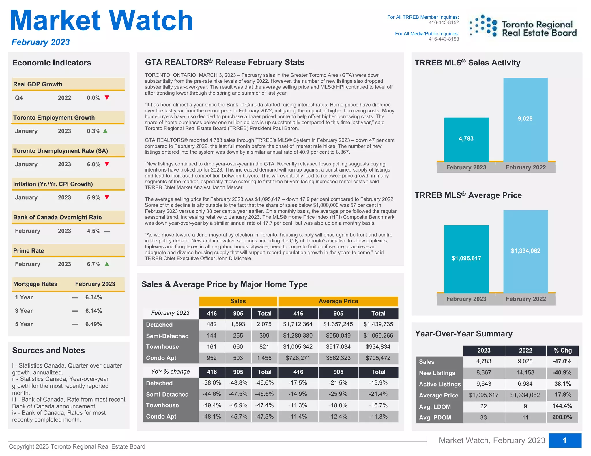 In February 2023, Greater Toronto Area (GTA) real estate sales plummeted by 47% compared to February 2022, largely due to decreased inventory and rising interest rates, while the average home price decreased to $1,095,617. The decline in sales has prompted discussions about the need for innovative housing policies to address supply shortages amid increased buying intentions. Market analysts expect that limited listings will create heightened competition among buyers, potentially leading to renewed price growth, particularly for affordable housing options.