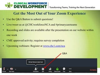 The document discusses expanding the role of registered nurses (RNs) in primary care settings. It describes how RNs can take on responsibilities like complex care management, active schedule management, using data to monitor patient outcomes, and conducting co-visits with providers to increase access to care. Co-visits allow RNs to address minor issues while providers briefly review cases. The approach has led to improved access and patient satisfaction at Community Health Center, Inc.