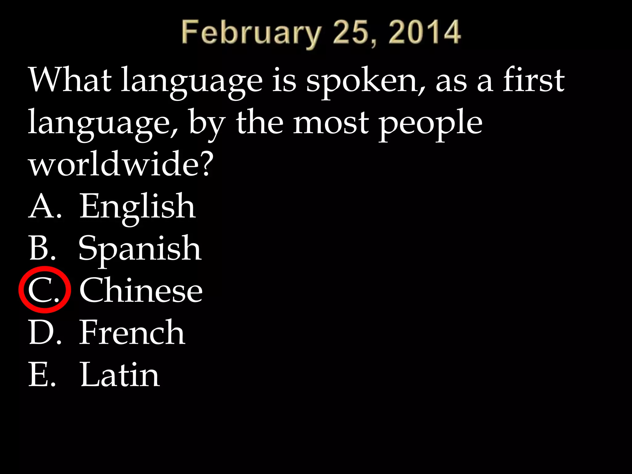 The document is a multiple choice question asking which language is spoken as a first language by the most people worldwide. The possible answers are: A) English, B) Spanish, C) Chinese, D) French, and E) Latin. The document provides a quiz question about the most widely spoken first language in the world.