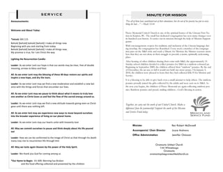 This document provides the order of worship for Oromocto & Pine Grove United Church. It includes details about the welcome, hymns, prayers, scripture readings, and announcements for the service. Visitors are welcomed and instructed where they can find Bibles, sign a guest book, or pick up information packages. The location of restrooms and a nursery are also noted. The document provides contact information for the minister and accompanist/choir director and concludes with upcoming event dates.