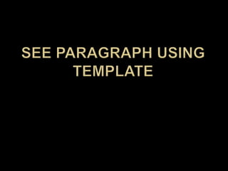 The document discusses the key components of writing a good paragraph that includes a paraphrase. It states that a good paragraph will include an introductory sentence, the paraphrase itself with proper citation, and a sentence commenting on the paraphrase. It provides an example of using these components to write a paragraph with a topic sentence introducing the main idea, evidence from a source in the form of a paraphrase, and an explanation connecting the topic sentence to the paraphrase with analysis and examples. The document emphasizes beginning with a clear main point, including specific evidence from sources, and explaining the relevance and importance of the evidence.