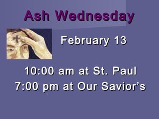 This document provides information about upcoming events at Our Savior's Lutheran Church, including Ash Wednesday services, a Young at Heart program on maple syrup production, Lent worship schedules, evening and daytime Lenten services, a Church in Society meeting, Boy Scout pancake supper, adult education classes, Sunday School assistance needs, a pictorial directory, online Bible study, crochet lessons, a pastors' internet radio show, breakfast Bible study, men's group meetings, recycling of ink cartridges and milk caps, greeting card sales, a prayer room, sponsoring flowers and radio broadcasts, flower delivery assistance, a magazine exchange, designating Thrivent Choice Dollars, coffee hour volunteer needs, and nametag updates.