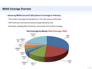 Samsung MENA secured 2,023 pieces of media coverage in February, an 11.5% decrease from January. Home appliances and home entertainment accounted for the most coverage, followed by corporate news. Nearly half the coverage came from all markets excluding Saudi Electronics Company and Tel Aviv, with Saudi Electronics Kingdom accounting for 19% of the total coverage.