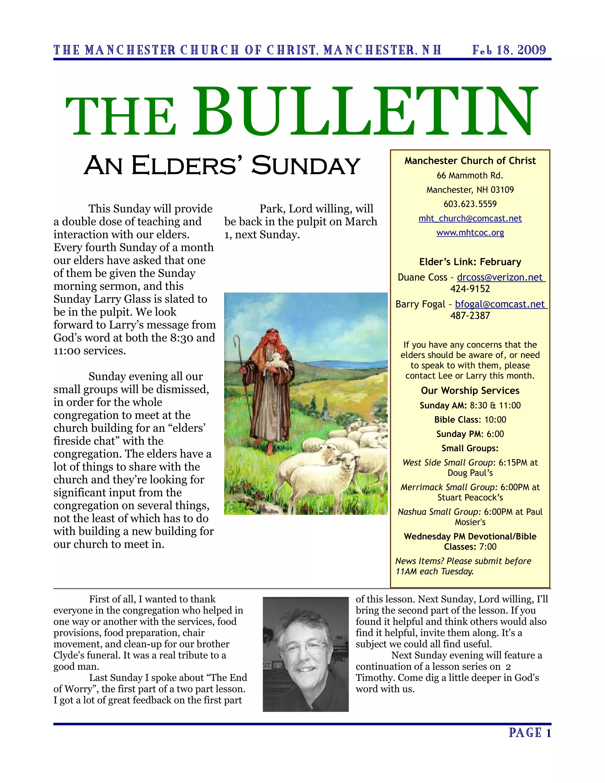 This bulletin from the Manchester Church of Christ announces that this Sunday will feature teachings from elder Larry Glass at both morning services, as well as an "elders' fireside chat" in the evening where the elders will share updates and seek input on building a new church building. It also provides updates on church activities including a Life Line health screening, a singing small group meeting, and a congregational meeting. Various prayer concerns and updates to the church directory are also included.