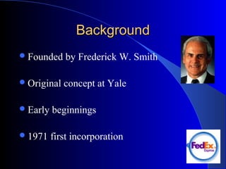 FedEx was founded in 1971 by Frederick W. Smith with its first day of operations on April 17, 1973 delivering 186 packages to 25 cities. It has since expanded globally to over 210 countries with 185,000+ employees and annual revenue of $22.5 billion in 2003. FedEx operates several subsidiaries including FedEx Express, FedEx Ground, FedEx Freight, and FedEx Custom Critical. It has achieved many milestones in its growth and now aims to operate independently while competing collectively.