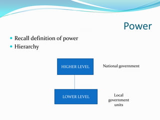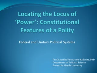 The document discusses the differences between federal and unitary systems of government, with federalism involving a division of sovereignty between central and regional authorities. It analyzes proposals for shifting the Philippines from a unitary to a federal system, with various options suggested for dividing the country into federal states or regions based on geography, culture, language or economic viability. The motivation is to potentially boost economic development, decrease political violence, and improve governance through a more decentralized system of government.