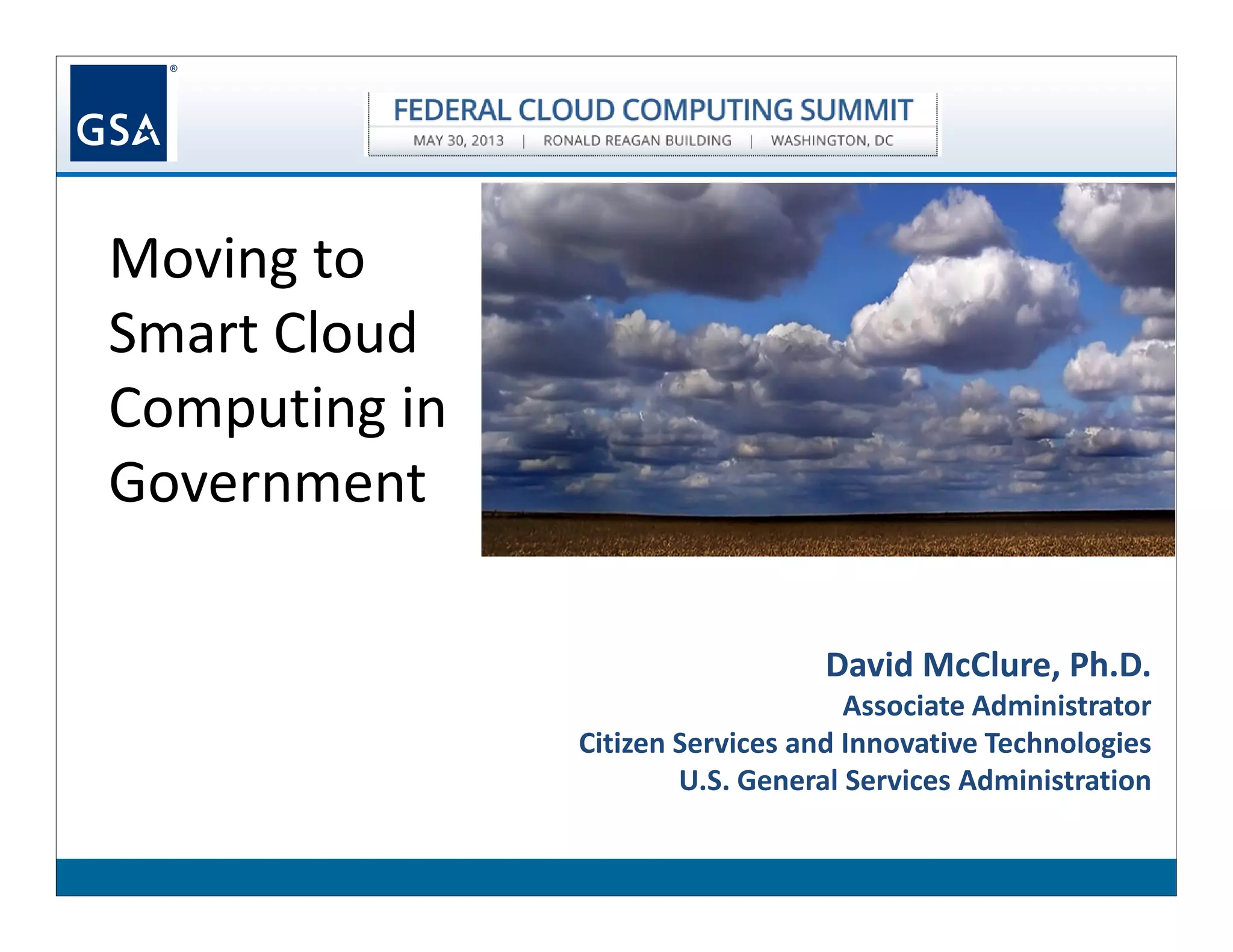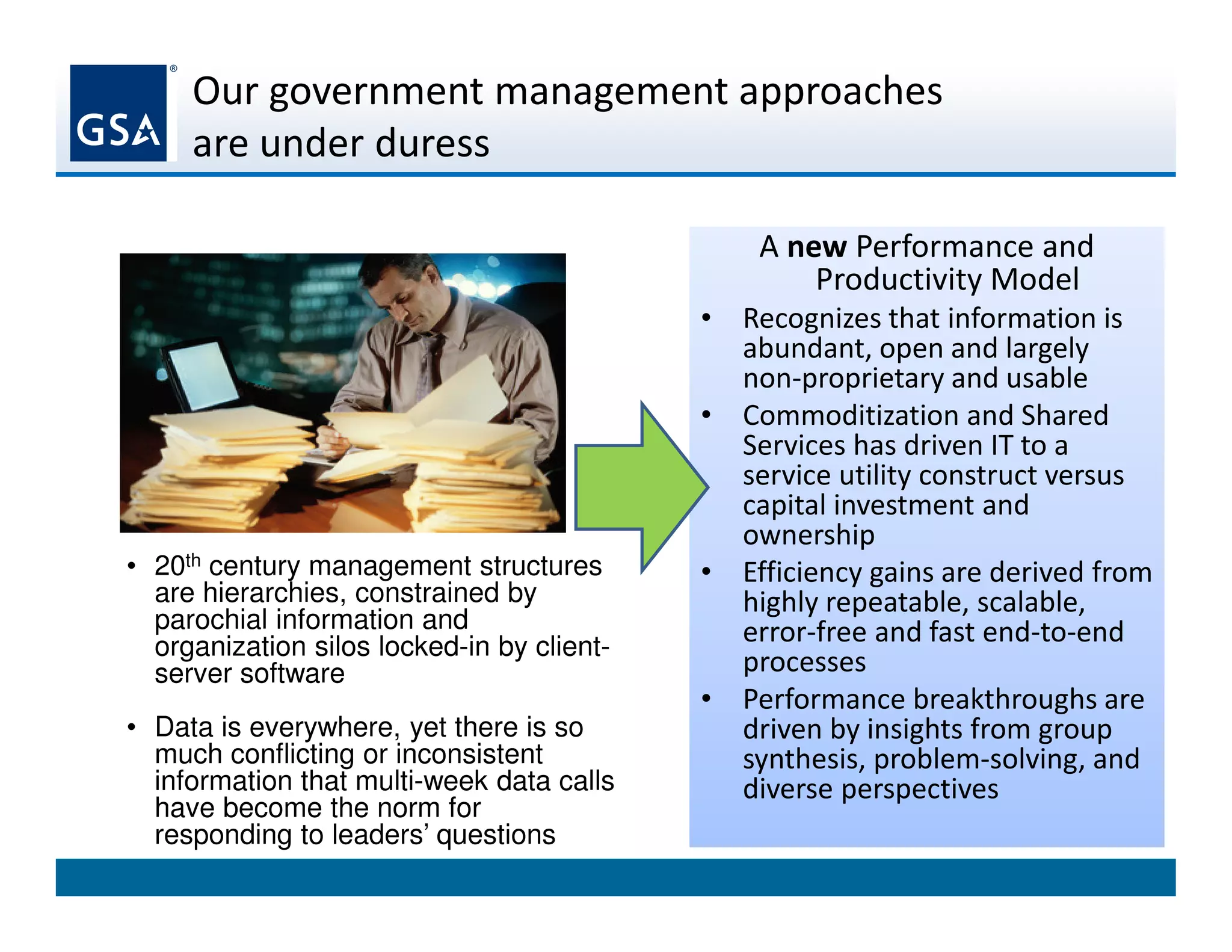 The document discusses how government management approaches are struggling to keep up with the growth of data and new technologies. It advocates for a shift to cloud computing and analytics to help governments better manage and gain insights from vast amounts of data. Moving data and processes to the cloud allows agencies to improve efficiency, scalability and information sharing across organizational silos. Paired with new analytics technologies, governments can leverage big data to enhance transparency, decision making and accountability.
