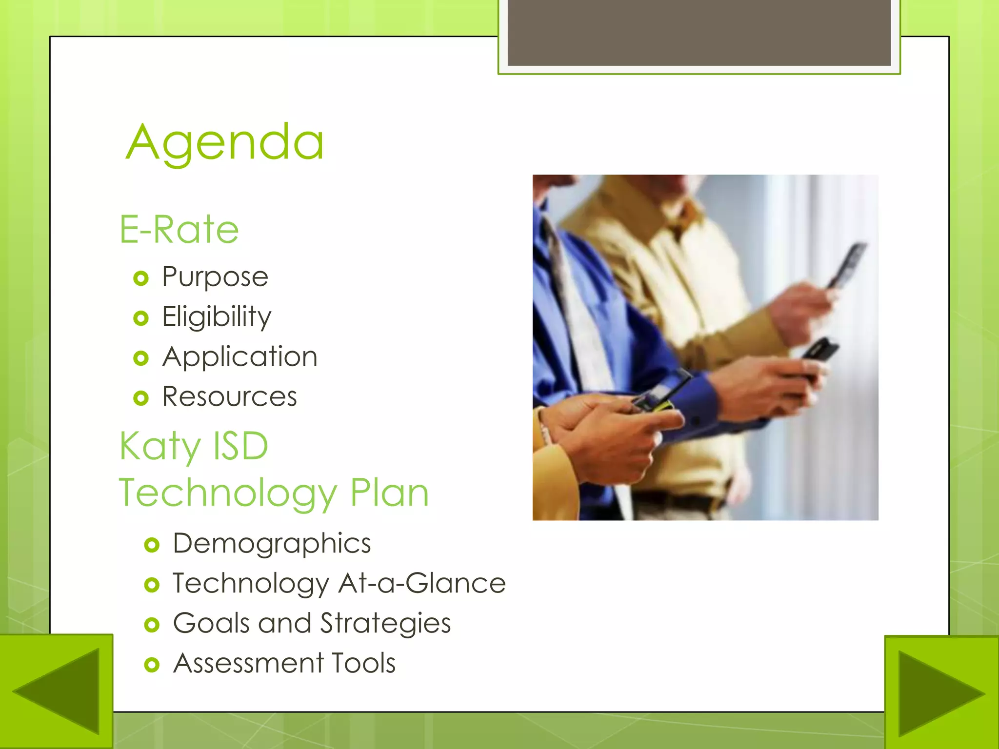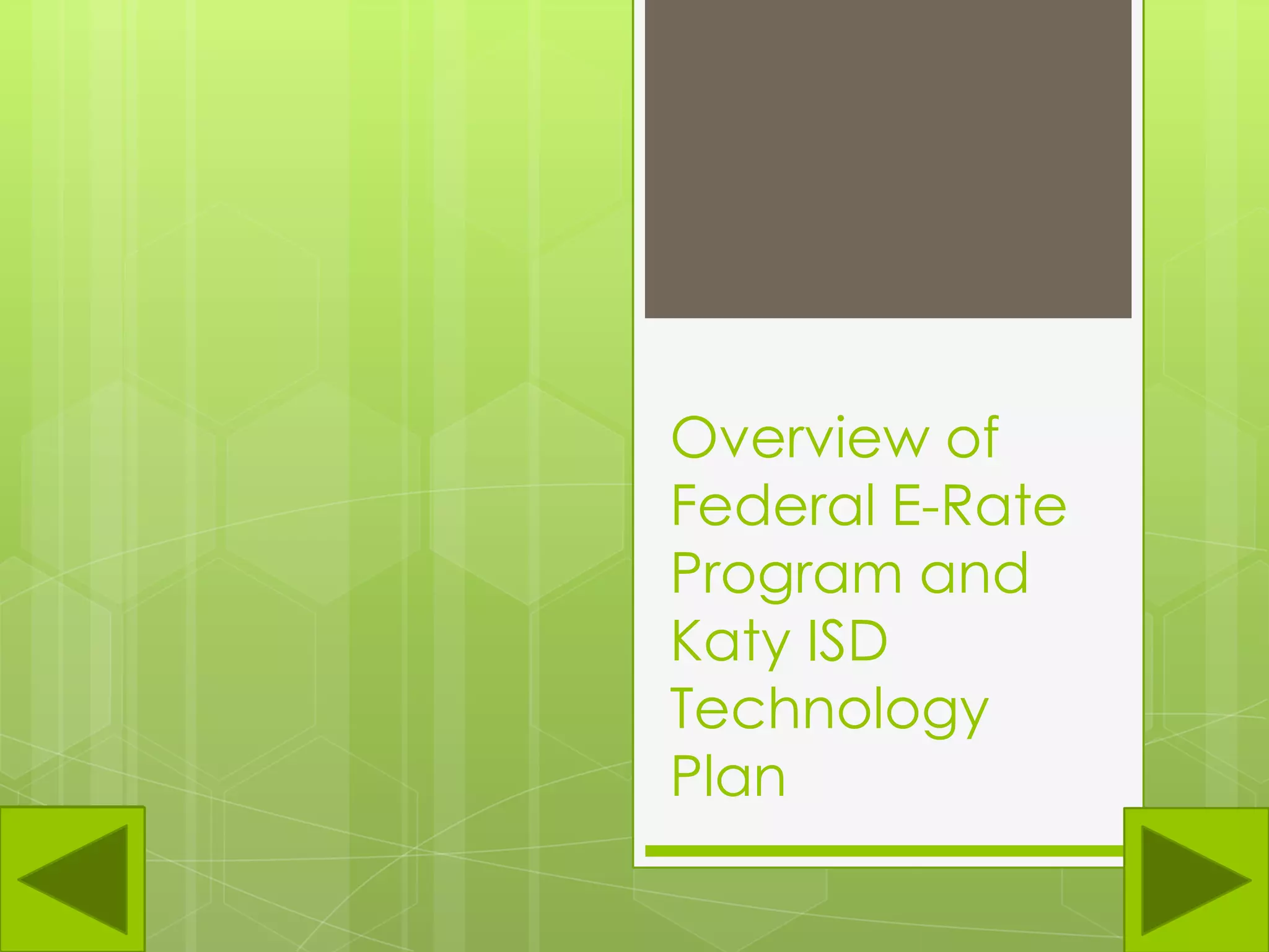 The E-Rate program provides discounts of 20-90% on telecommunication services to eligible schools and libraries. To qualify for funding, applicants must have a technology plan that details goals for integrating technology through professional development, innovative learning environments, and high-performance infrastructure. Katy ISD's technology plan aims to engage all students through technology, equip educators with necessary tools and skills, and provide 21st century learning resources. Assessment tools are used to evaluate progress towards meeting strategic goals and priorities around technology integration across the curriculum.