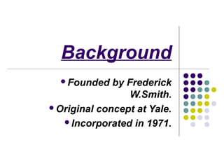Federal Express (FedEx) is a courier and logistics services company headquartered in Memphis, Tennessee. It was founded by Frederick W. Smith in 1971 and began operations on April 17, 1973 with 186 packages delivered to 25 cities. Today, FedEx operates in over 220 countries and territories with a global network spanning Asia Pacific, Canada, Europe, Middle East, and Africa. FedEx has evolved from a courier company to a third-party logistics service provider to remain competitive and effectively manage the flow of resources through integrated information, transportation, inventory, and other services.