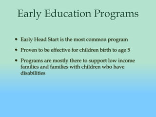 Federal funding for early education programs supports low-income families and those with children who have disabilities. These programs aim to prepare young children for primary school by addressing factors that contribute to readiness like family support and access to healthcare. However, federal funding only covers administrative costs, while services require the highest funding. Previous budget cuts have reduced access to early education for some children and families. Recent proposals aim to increase funding for early childhood programs to expand access, including a universal preschool program and grants for states. However, implementing large-scale changes will take time and funding these expansions may reduce support elsewhere in the budget.
