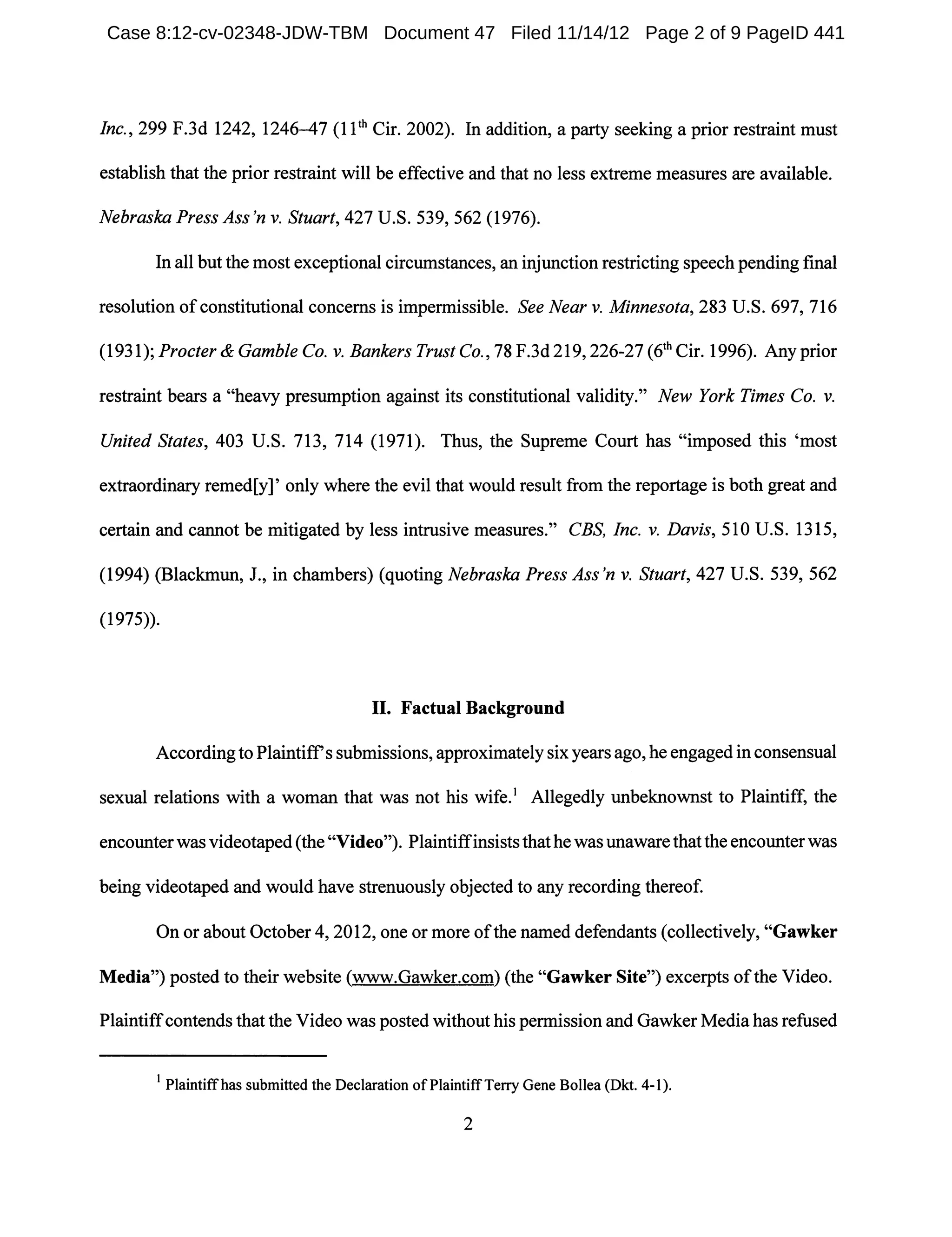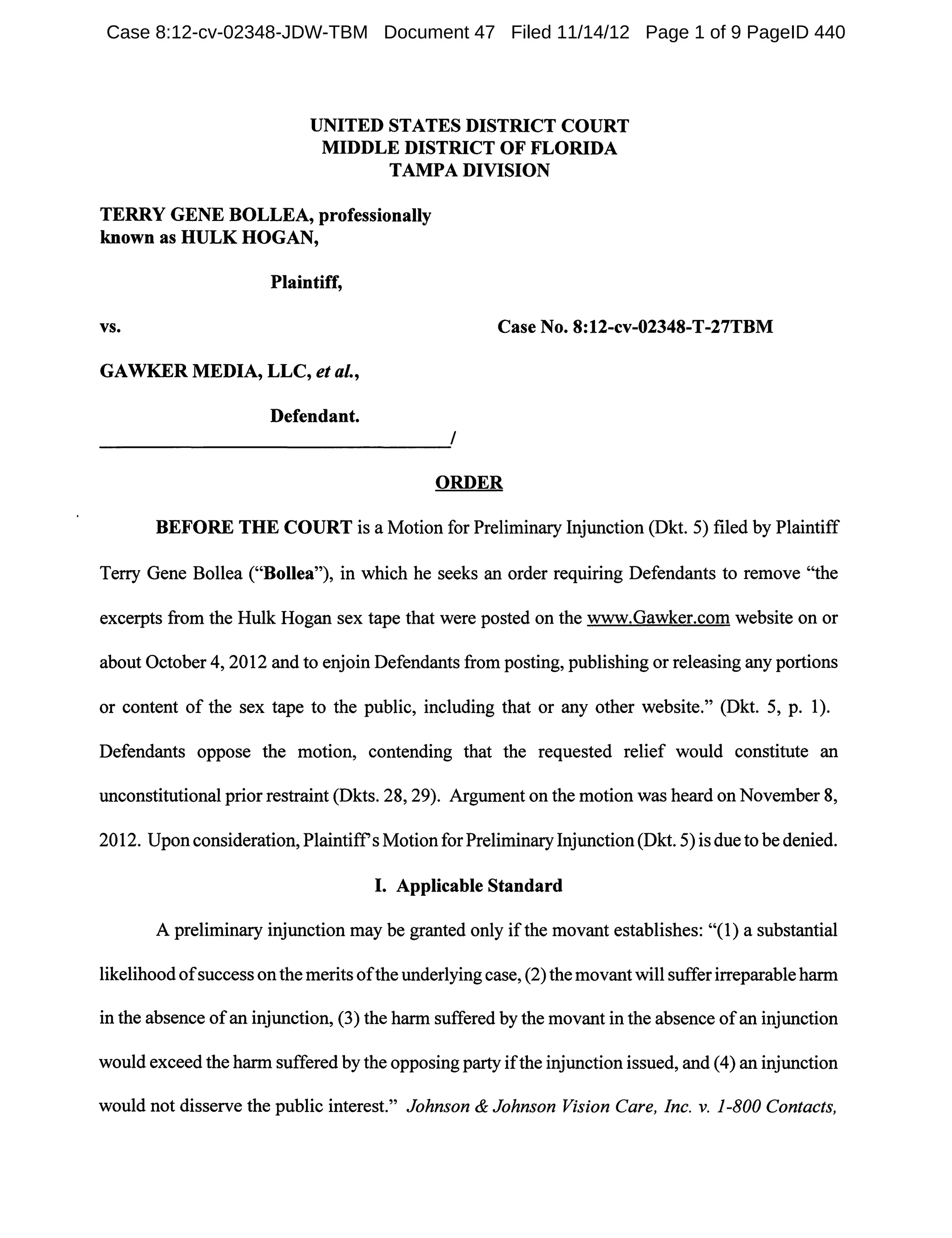 The court denied Hulk Hogan's request for a preliminary injunction requiring Gawker Media to remove excerpts of Hogan's sex tape from their website. The court found that Hogan did not meet the high burden required for a prior restraint on speech under the First Amendment. While Hogan has a privacy right in the sex tape's contents, Gawker's First Amendment rights outweigh Hogan's in this case because the tape discusses matters of public concern, such as Hogan's public persona from his reality show and autobiography discussing his sex life. As such, Gawker's decision to publish excerpts is protected editorial discretion that cannot be restricted with a preliminary injunction. The court found Hogan's privacy interests are better addressed through damages