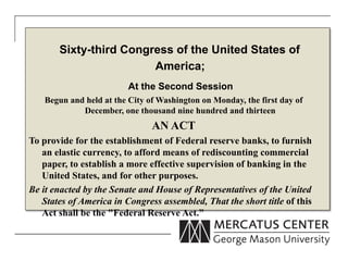 The document provides an overview of the history and functions of the Federal Reserve System. It summarizes that the Federal Reserve was established in 1913 to address financial panics by providing an elastic currency and a lender of last resort. It took over clearinghouse roles from private banks. Today, the Federal Reserve has five key roles: acting as a bankers' bank, lender of last resort, financial supervisor and regulator, currency issuer, and conductor of monetary policy. It oversees various types of financial institutions and enforces numerous regulations.