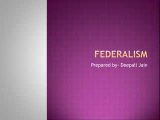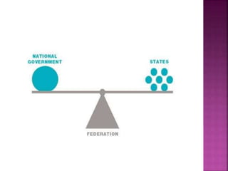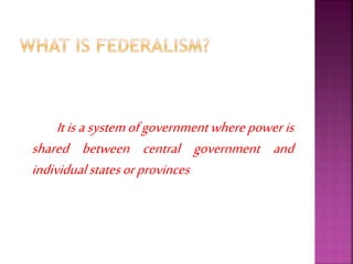 The document discusses the federal system of government where power is shared between central and state governments, highlighting the constitutional guarantees that establish the authority of each level. It explains the distribution of powers across different government tiers in India, including the Union, state, and local levels, and the significance of linguistic states and language policy in promoting unity. Additionally, it addresses the dynamics of center-state relations and the role of decentralization in strengthening local governance.