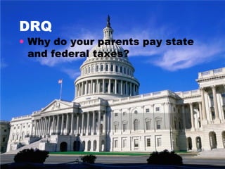 The document discusses the division of powers between the federal and state governments in the United States. It outlines three types of delegated powers given to the federal government by the Constitution: expressed powers that are listed, implied powers that are suggested but not listed, and inherent powers that national governments have historically possessed. It also mentions that states and the federal government share concurrent powers and that reserved powers belong to the states and are those not given to the federal government or prohibited to the states.