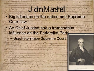 John Marshall had a significant influence on the Supreme Court and federalism through key cases during his tenure as Chief Justice from 1801 to 1835. In McCulloch v. Maryland, Marshall established the doctrine of implied powers, finding the federal government had implied powers beyond those explicitly enumerated. In Gibbons v. Ogden, Marshall broadened Congress's power to regulate interstate commerce. His rulings strengthened the power of the federal government and limited the power of the states, representing the Federalist view of a stronger national government over state governments.
