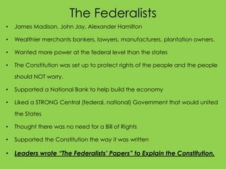 The Federalists, led by figures like James Madison, Alexander Hamilton, and John Jay, supported a stronger central government and ratifying the Constitution as written. The Anti-Federalists, including Thomas Jefferson and George Mason, represented farmers and lower classes who wanted more state power and opposed the Constitution without added protections for individual rights like a Bill of Rights. The two sides debated the appropriate balance of federal versus state power.