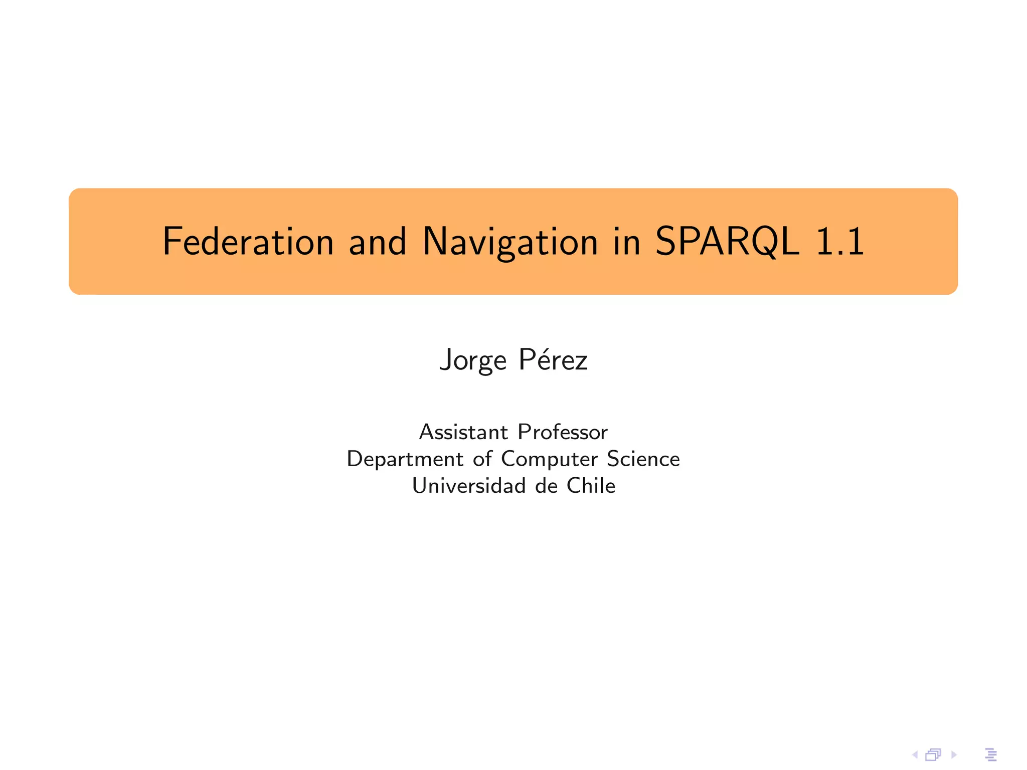 This document discusses new features in SPARQL 1.1, including federation using the SERVICE operator and navigation using property paths. It provides an overview of the basics of SPARQL and the syntax and semantics of SPARQL 1.0 queries before explaining federation, which allows querying multiple datasets, and navigation, which allows navigating RDF graphs using regular expressions to match properties. It also discusses the evaluation procedures and complexity of these new features.