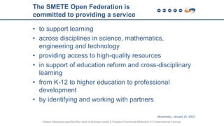 The document discusses the SMETE Open Federation's commitment to enhancing geoscience education by providing access to high-quality resources and fostering cross-disciplinary learning from K-12 to professional development. It outlines a development philosophy focused on constructivist education and emphasizes the importance of connecting content with community and services through integrative tools. Additionally, it introduces various services, such as embedded assessments and content management systems, aimed at improving educational outcomes.