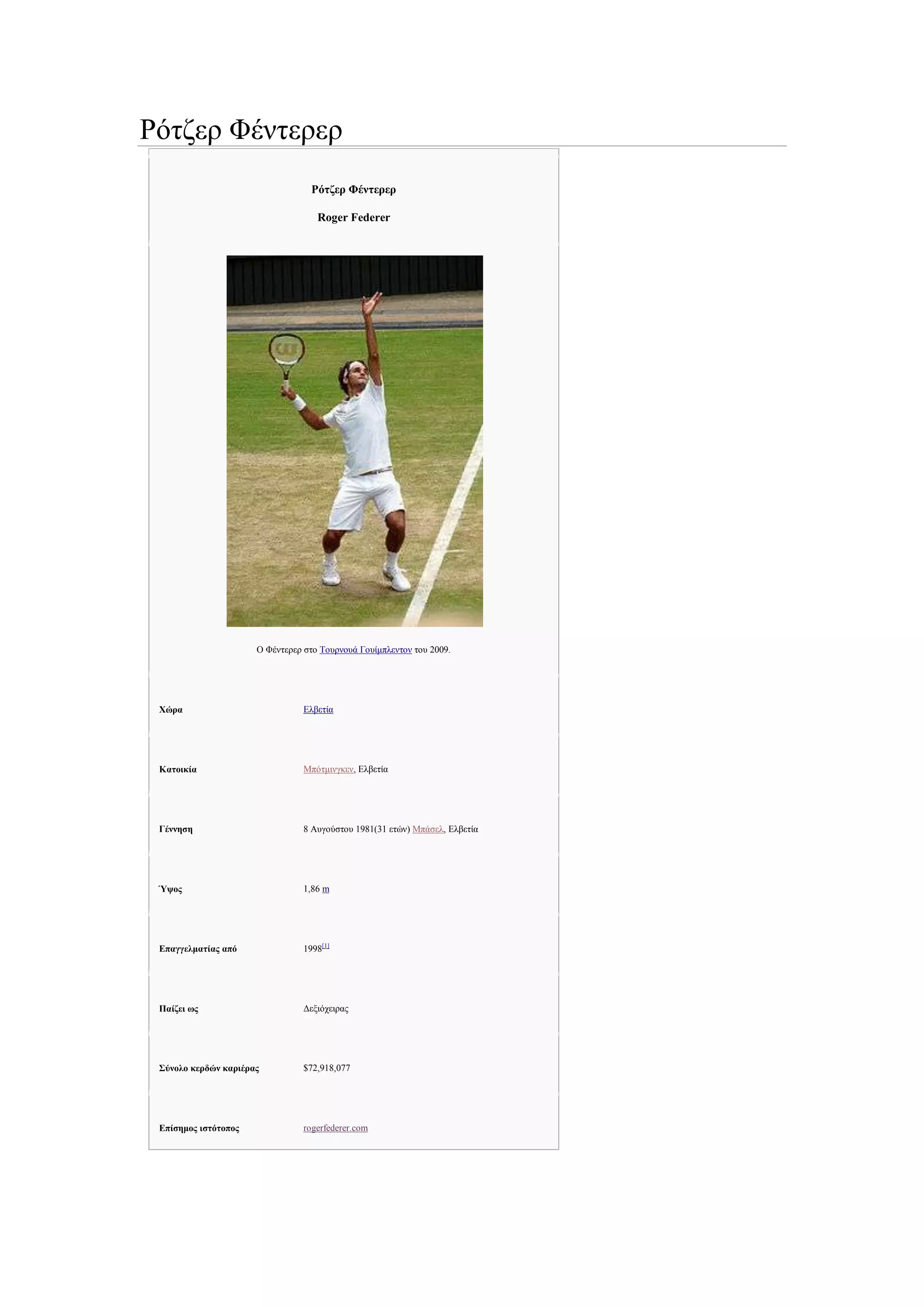 Ρόηζεπ Φένηεπεπ Roger Federer Ο Φέληεξεξ ζην Σνπξλνπά Γνπίκπιεληνλ ηνπ 2009. Χώπα Διβεηία Καηοικία Μπφηκηλγθελ, Διβεηία Γέννηζη 8 Απγνχζηνπ 1981(31 εηψλ) Μπάζει, Διβεηία Ύτορ 1,86 m Επαγγελμαηίαρ από 1998[1] Παίζει υρ Γεμηφρεηξαο ύνολο κεπδών καπιέπαρ $72,918,077 Επίζημορ ιζηόηοπορ rogerfederer.com