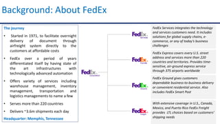 FedEx started in 1971 to provide affordable overnight document delivery through airfreight. Over time, it developed state-of-the-art infrastructure and automated technology. FedEx now offers a variety of supply chain services including transportation, logistics, warehouse management, and inventory management across more than 220 countries. It delivers approximately 3.6 million shipments daily through a vast global network of facilities and fleet. FedEx has emerged as a leading global provider of supply chain management services by leveraging its infrastructure and network to better manage customers' supply chains.