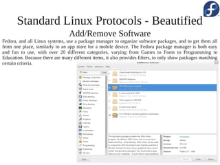 The document discusses several features of the Fedora Linux distribution including its package manager, software update process, terminal interface, workspaces, default applications, desktop environments, and easy installation process. It highlights how Fedora implements security features like SELinux and provides customizable spins beyond the main desktop environments.