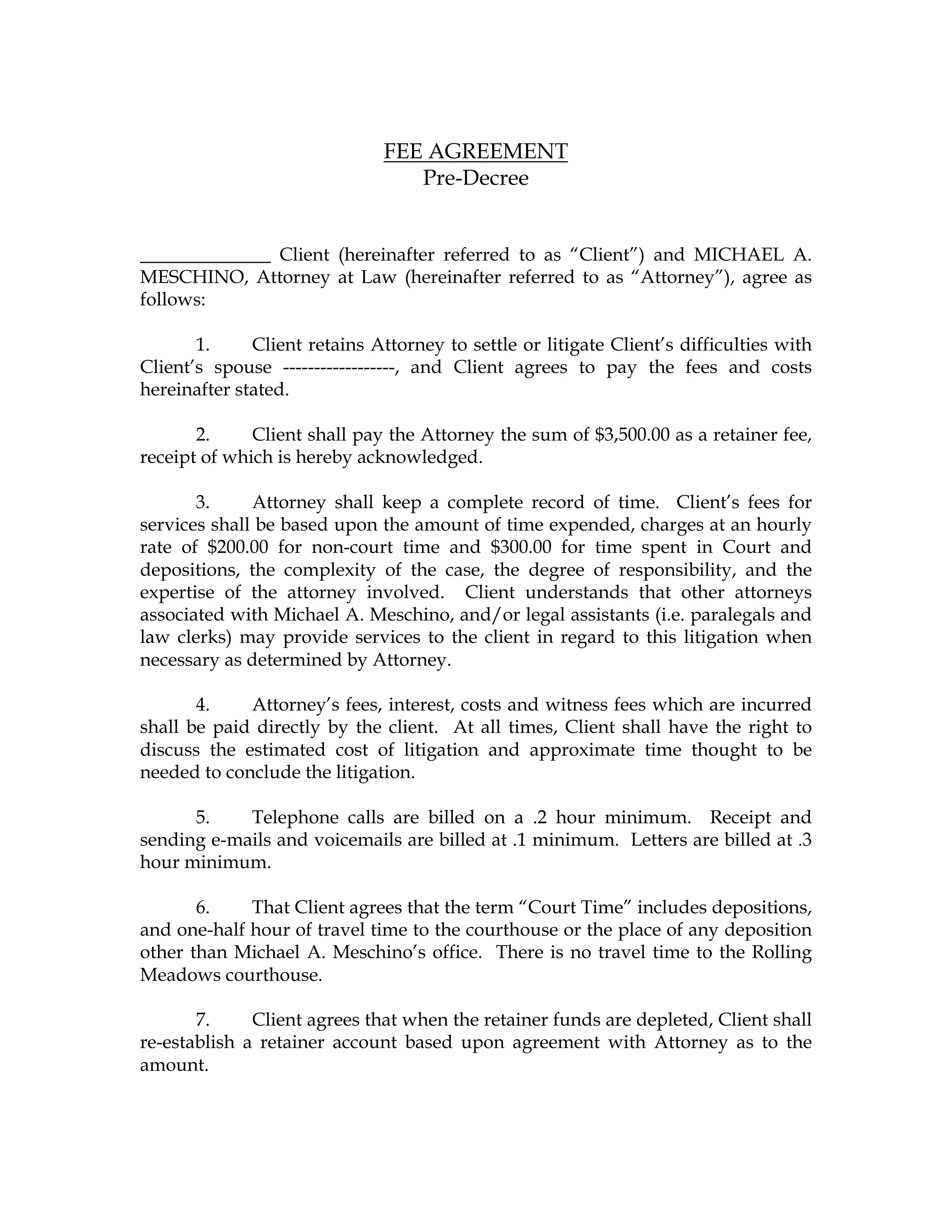 The document is a fee agreement between a client and attorney Michael A. Meschino for pre-decree legal services related to the client's marital difficulties. The client agrees to pay Meschino an initial $3,500 retainer fee and hourly rates of $200 for non-court work and $300 for court and deposition time. The client is responsible for all legal fees, costs, expenses and interest accrued on their account throughout the pre-decree legal work.