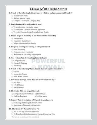 This feedback form collects information about a household's electricity consumption and asks questions to assess knowledge about energy conservation. It collects the household service connection number, recent bi-monthly electricity consumption and billing amounts. It asks what energy conservation measures could be taken, expected savings, and contact information for queries. Multiple choice questions test knowledge about efficient bulbs, earth leakage circuit breakers, reducing usage, refrigerator usage, appliance star ratings, water heater types, sunny days in the city, bill payment methods, switching off appliances correctly, and the vision of "Powerful Kovai" as transforming Coimbatore into an energy conserved city.