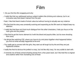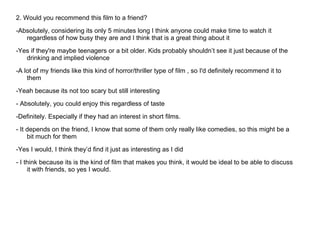 The document contains reviews of a short film from several individuals. They provide positive feedback on aspects like the film's handling of serious subject matters, use of shock value without graphic violence, evolving plot, focus on main characters, horror elements, and ability to make the viewer piece together the story. They also recommend sharing it with friends and indicate they understood the overall premise involving a psycho killer at a school. Ratings of the 5-minute film ranged from 3 to 5 out of 5.