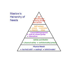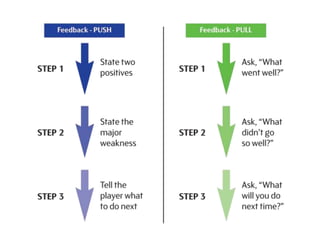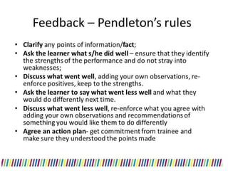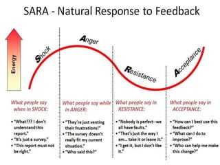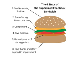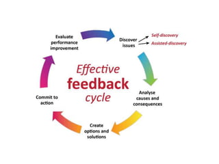The document discusses feedback and how to give and receive it effectively. It defines feedback as information about a system's output that is used to modify future outputs. Feedback should (1) identify strengths and weaknesses, (2) focus on continuous quality improvement, and (3) be given privately as soon as possible on 2-3 key areas. When receiving feedback, one should listen carefully, assume a constructive intent, pause before responding, ask questions, and express thanks. Effective feedback uses criteria-based phrases, focuses on no more than two traits, and allows the recipient to apply the feedback in revised work.