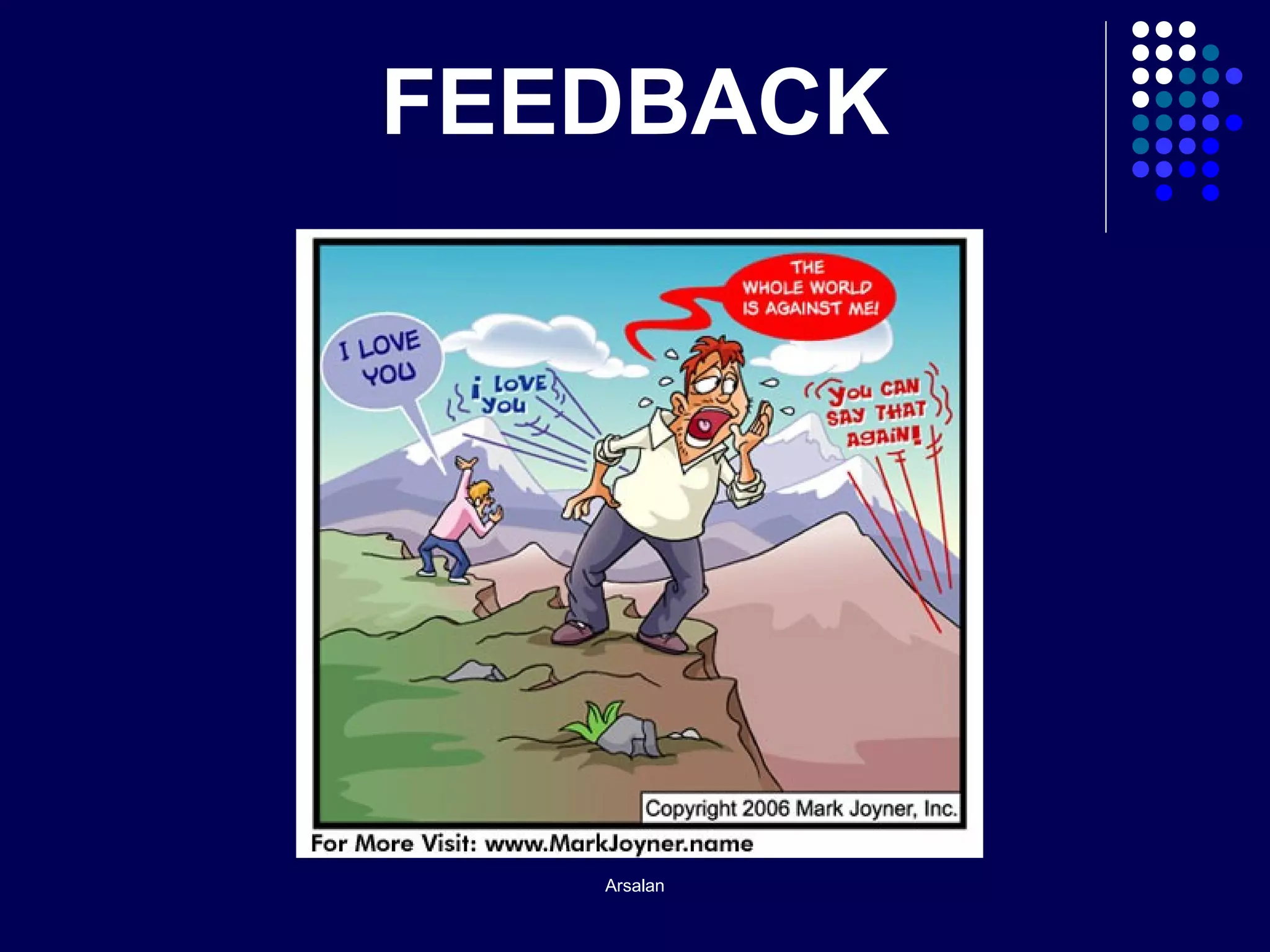 This document defines feedback as an objective appraisal of a student's performance aimed at improving clinical skills. It discusses that feedback is a skill that helps improve performance, motivates students, and facilitates change. The document outlines best practices for providing feedback, including being constructive, timely, and focusing on both positives and negatives. It recommends the "sandwich technique" of starting and ending with positives to avoid degrading students. Key steps in feedback include identifying strengths and weaknesses, setting goals, and summarizing suggestions for improvement.