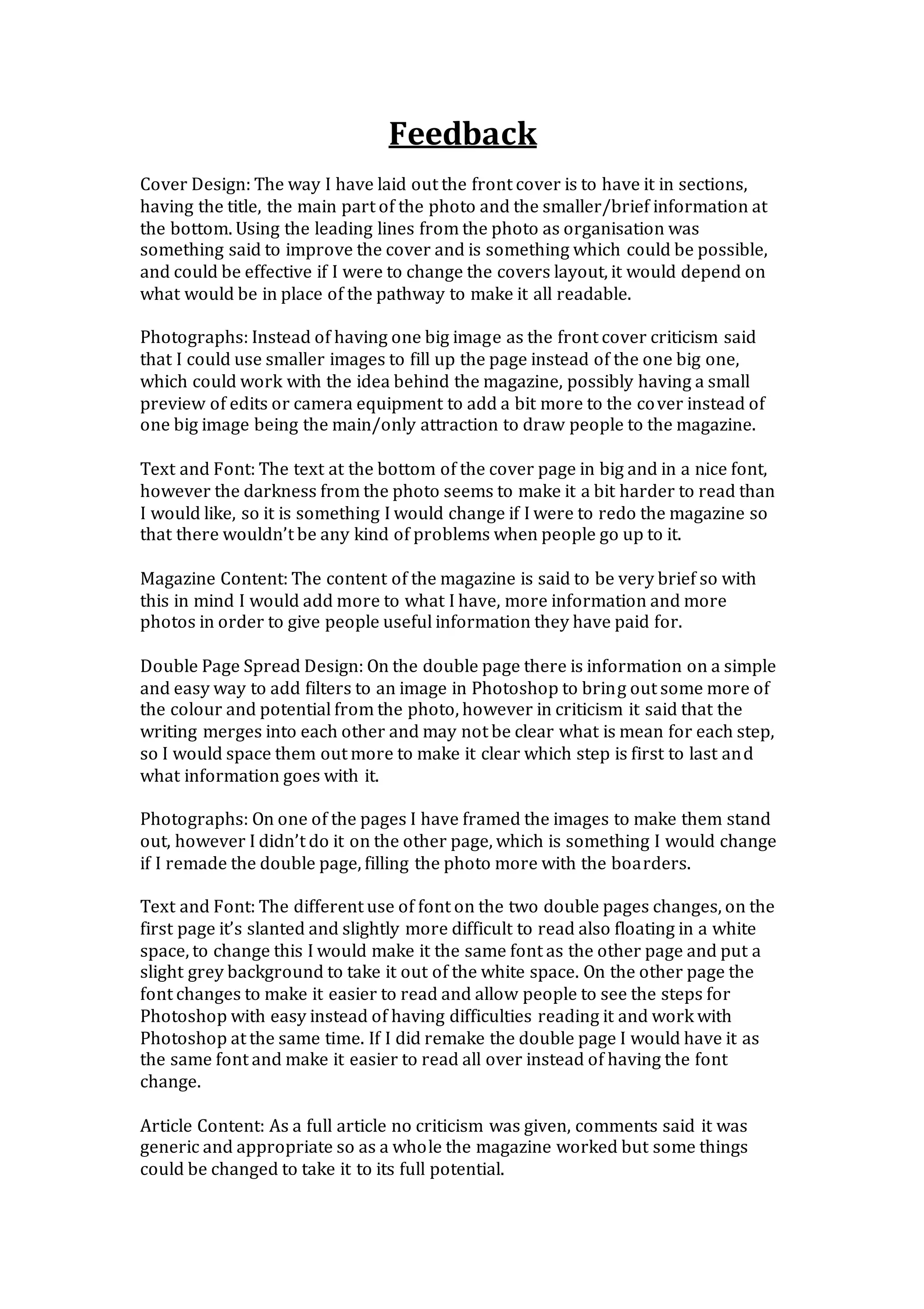 The feedback provided suggestions to improve the design and layout of the magazine cover and interior pages. For the cover, it was suggested to use multiple smaller images instead of one large image, and to adjust the font color for better readability. For interior pages, it was advised to provide more detailed instructions and content, use consistent formatting and font styles between pages for clarity, and add borders around all images for visual balance. The article content itself received positive feedback with no changes suggested.