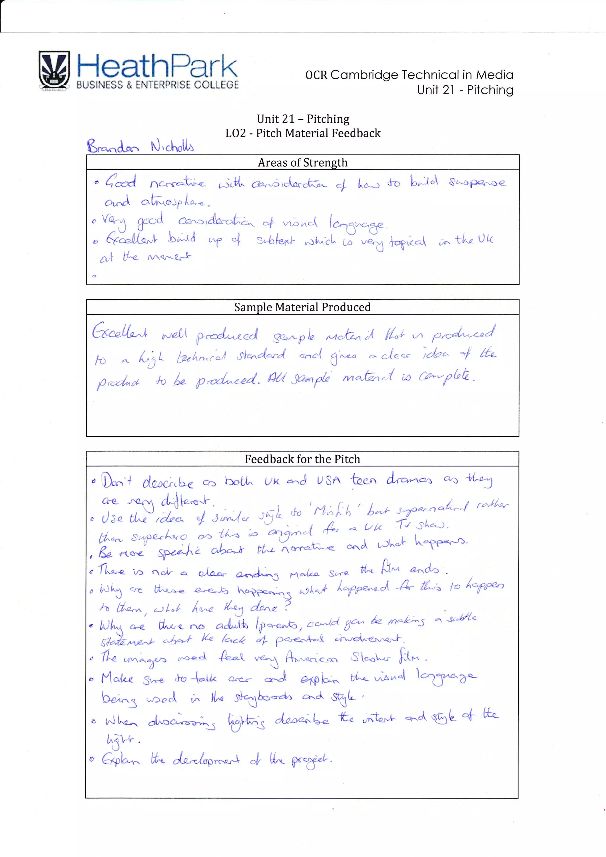 The document provides feedback on a pitch for a new product or service. The feedback notes several strengths of the pitch, including a clear understanding of the target audience and well-structured presentation. Suggestions for improvement include developing the business model and value proposition further to better convey how the idea would generate revenue. Samples of materials produced were requested to gain a clearer sense of what was being proposed.