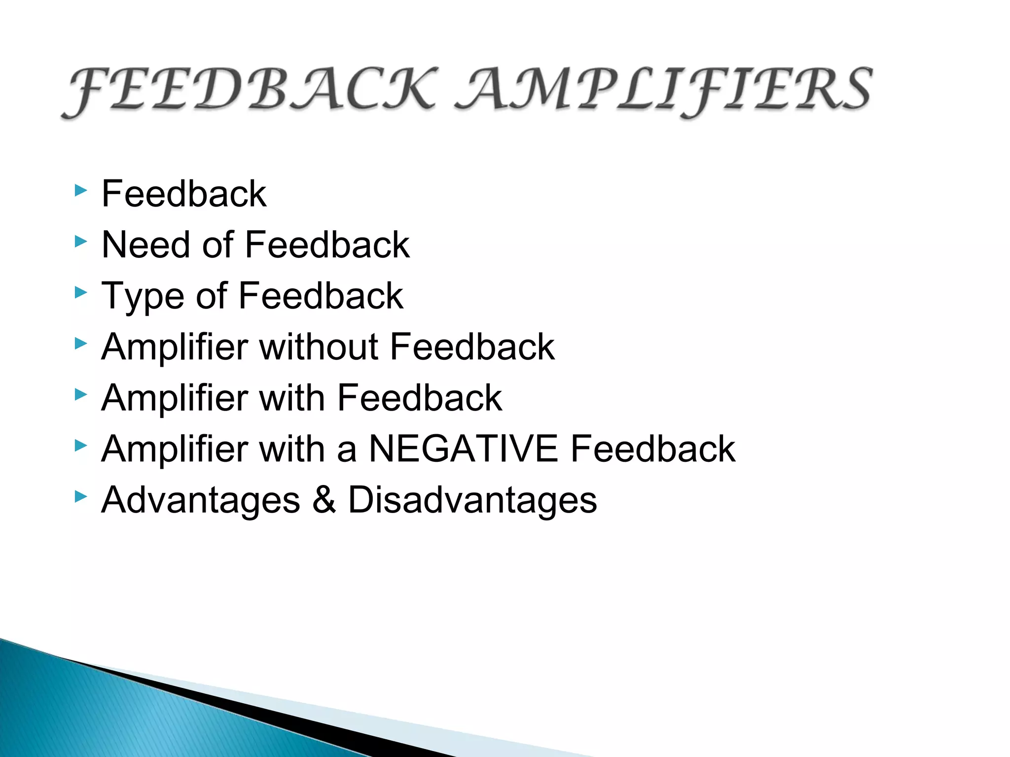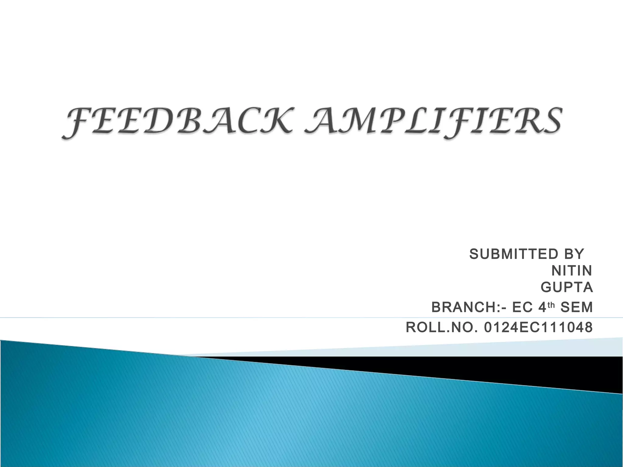 The document discusses feedback in amplifiers. It defines feedback as part of the output signal being returned to the input. There are two types of feedback: positive feedback where the feedback signal is in phase with the input, and negative feedback where they are out of phase. An amplifier without feedback simply has a gain A, while one with feedback has a lower gain determined by the feedback factor. Negative feedback has advantages like stabilizing gain but reduces gain, and has applications in electronic amplifiers, power supplies, and wideband amplifiers.