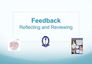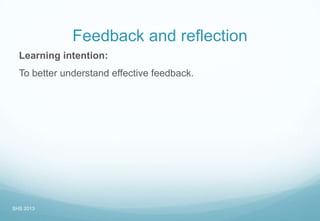 The document discusses feedback and reflection in learning. It defines feedback as providing explicit, timely, and personalized feedback between teachers and students to better understand what is being learned. Reflection involves students revisiting their learning to identify new knowledge, how their understanding changed, and the strategies they used. Research shows that feedback and reflection can significantly improve learning, with effect sizes of 0.75. The document provides details on conducting effective feedback and reflection in the classroom, including reviewing lessons, linking learning to goals and success criteria, and asking students questions to reflect on their learning at different levels.