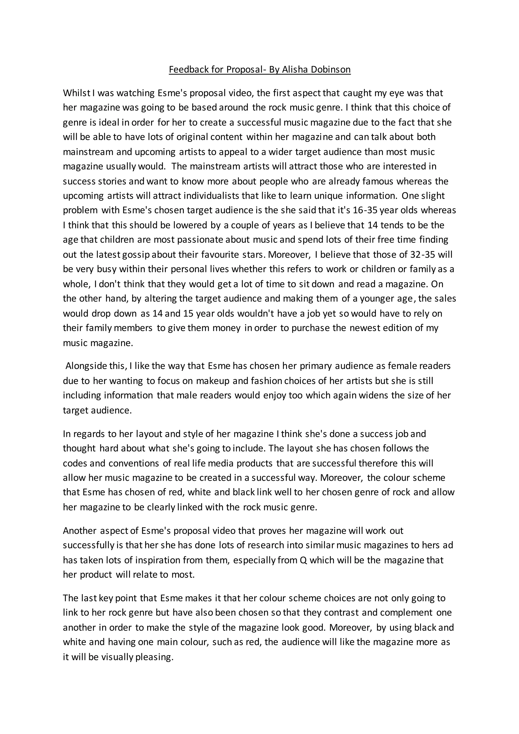 Esme proposed creating a rock music magazine targeted towards females ages 14-32. While the reviewer thinks the target age range should be lowered to 14-30, they appreciate that Esme included content to appeal to both male and female readers. The reviewer also compliments Esme's magazine layout, color scheme, and research into similar successful magazines. They conclude that if Esme implements her proposal, she will likely create a very successful music magazine by the end of the course.