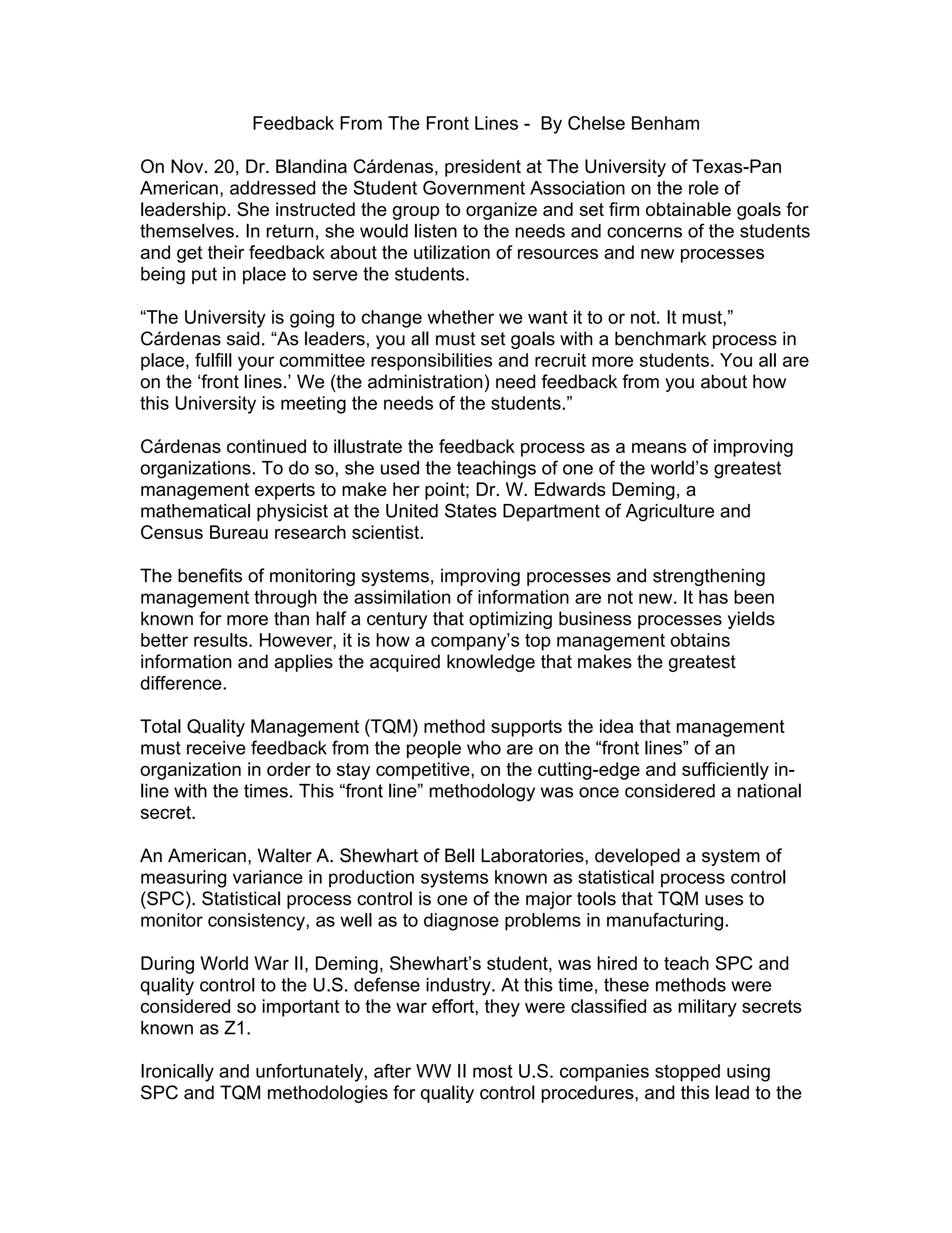 Dr. Blandina Cárdenas addressed the Student Government Association about the importance of feedback from students. She instructed students to set obtainable goals and said the administration would listen to student needs and concerns. Cárdenas emphasized that feedback is essential for organizations to improve, as taught by management expert W. Edwards Deming. Deming developed statistical process control to monitor consistency and diagnose manufacturing problems. His teachings helped transform Japanese manufacturing after World War II. Deming stressed the importance of continuous feedback from frontline employees to identify issues not apparent to management.