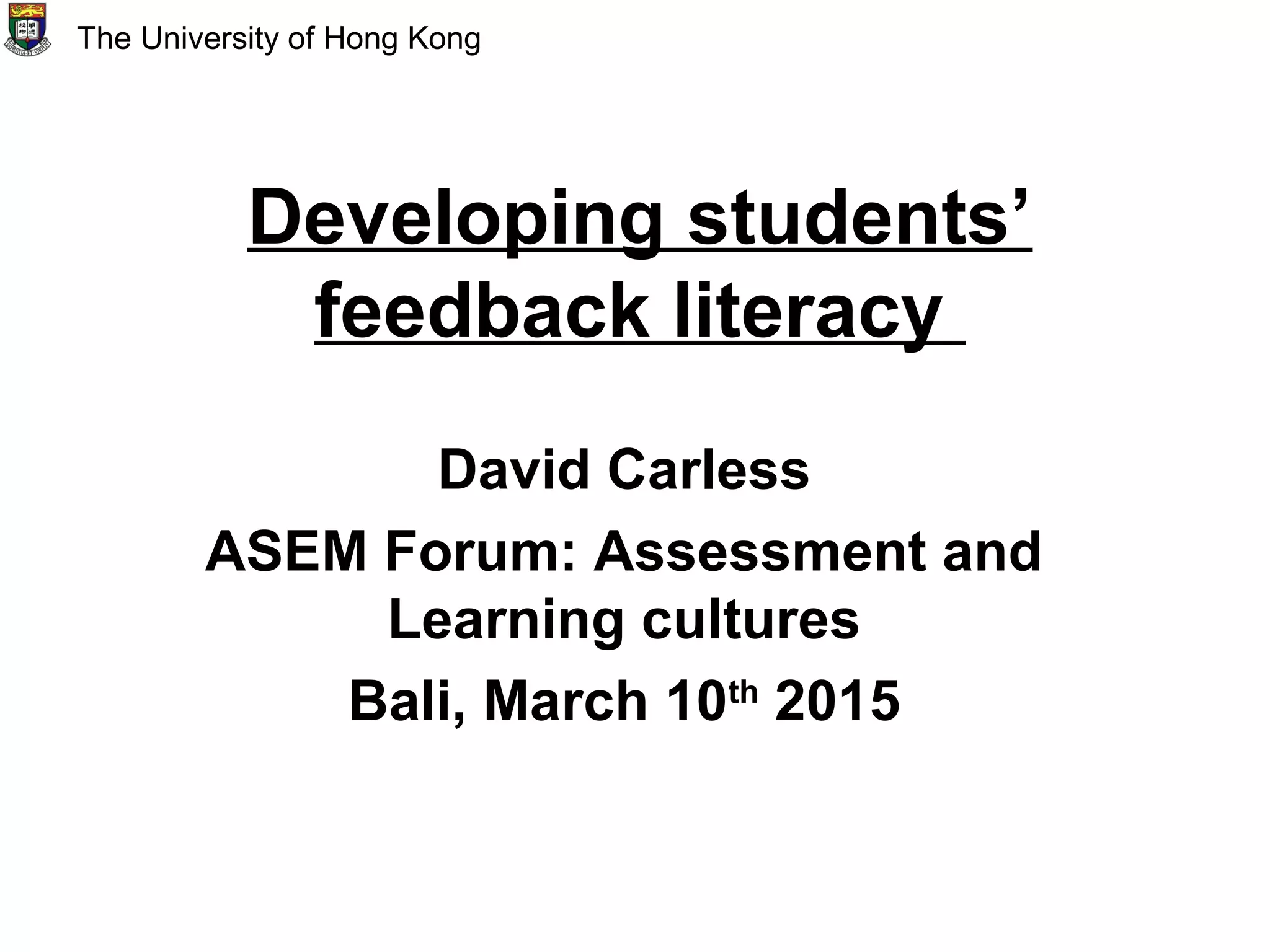 This document discusses developing student feedback literacy. It begins by outlining the importance of feedback and challenges students face in understanding and using it. It then defines feedback literacy as having three dimensions: epistemological, ontological, and practical. The document proposes several strategies for developing student feedback literacy, including assessment dialogues to understand standards, peer feedback, using criteria and rubrics, and analyzing exemplar work. It emphasizes that feedback is a social process requiring care and trust between teachers and students, and that teachers must help students understand how to properly use feedback.