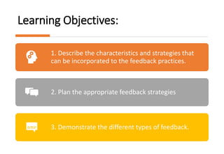 The document outlines effective feedback practices for teaching and learning, emphasizing the importance of characteristics like timeliness, clarity, and improvement focus. It includes various feedback strategies, modes, and examples of group activities designed to enhance understanding and application of feedback. Additionally, it encourages instructors to create environments conducive to meaningful feedback interactions through techniques like 'feedback sandwiches' and reflection time.