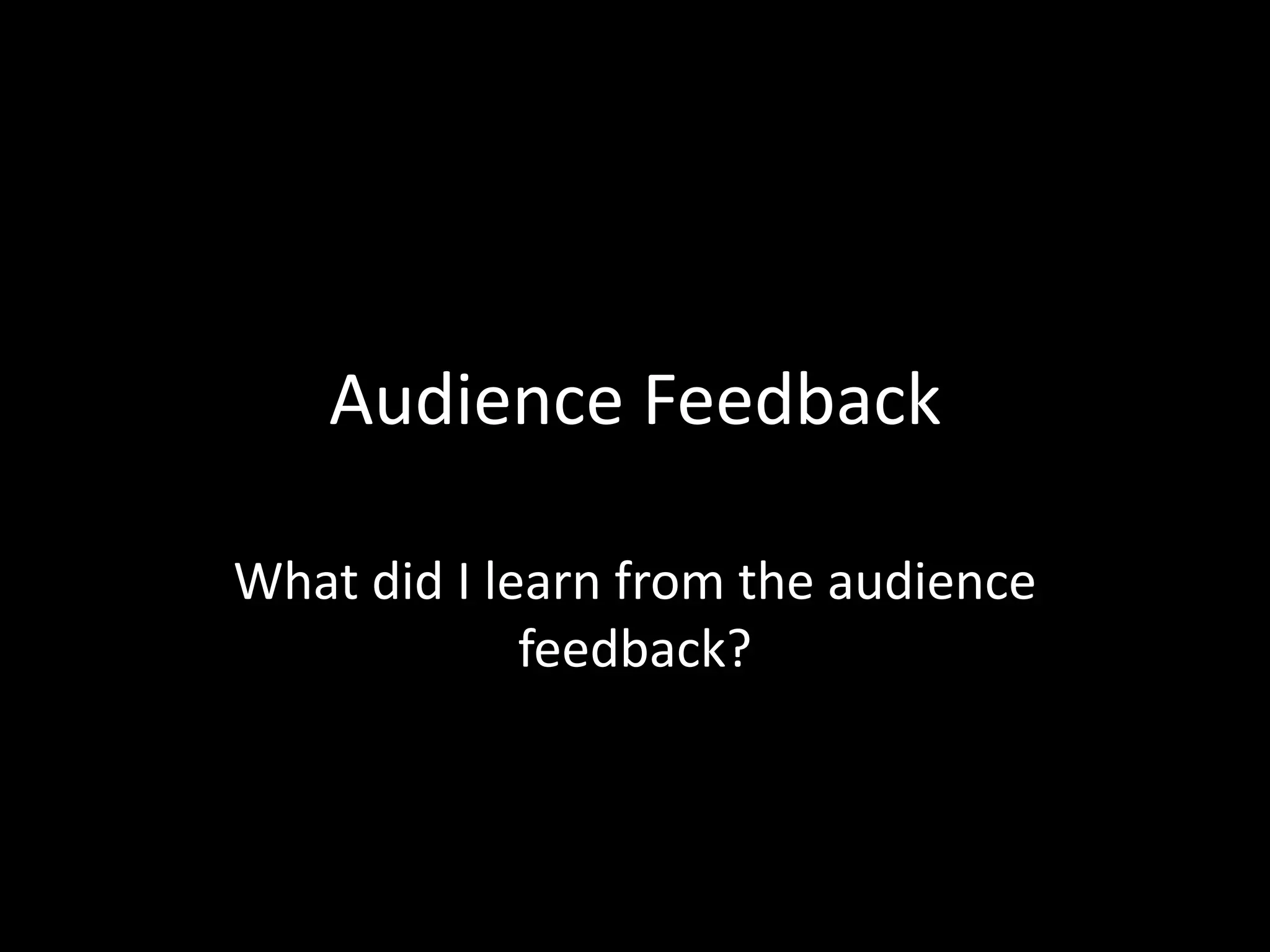 The audience feedback for the video was overwhelmingly positive, with all 17 participants indicating they liked it. Specific aspects that were well-received included the believable narrative, filming techniques like quick cuts and interesting angles, and how well the video matched the song. Some areas for improvement included shaky camera work, an confusing narrative that required too much effort to understand, and unclear transitions/filtering in flashbacks. While most participants understood the overall story, a minority had an oppositional reading and were unclear on exactly what the character Chris did. This confirms the narrative could have been made clearer by providing more explicit text messages and details for the audience to decode.