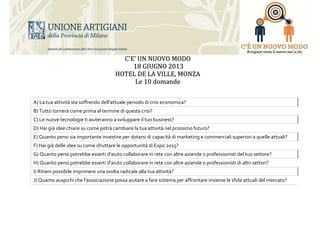Il documento discute le opinioni degli imprenditori riguardo alle sfide economiche attuali e alle opportunità future. La maggioranza degli intervistati considera le nuove tecnologie e le capacità di marketing fondamentali per il successo del proprio business, ma quasi tutti non vedono spunti di crescita nell'Expo 2015. Inoltre, emerge una maggiore propensione a collaborare con aziende di settori diversi piuttosto che con imprese dello stesso settore.