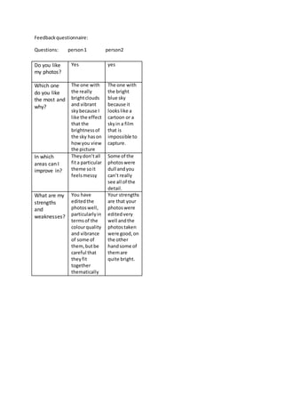 This feedback questionnaire contains responses from two people reviewing some photos. Person 1's favorite photo is one with bright clouds and sky because of the brightness. Their suggestion is that the photos should have more of a unified theme. Person 2's favorite is one with a bright blue sky that looks impossible. Their feedback is that some photos were dull and lacked detail, while praising the color editing but noting some photos were too bright.