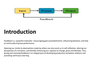 The document emphasizes the importance of effective feedback in the workplace, outlining key principles for giving and receiving feedback to enhance performance and relationships. It recommends making feedback regular, timely, specific, and balanced, while focusing on both positive and developmental aspects. Strategies for effective feedback processes are provided, highlighting the significance of self-reflection and preparation for both managers and staff.