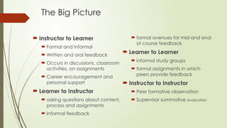 The document discusses effective feedback mechanisms within educational settings, emphasizing its vital role in enhancing student learning and self-assessment. It outlines various feedback types including formative and summative feedback and provides strategies for instructors on how to deliver feedback efficiently, including the use of rubrics and prioritizing feedback. The document also highlights the importance of knowing students personally to tailor feedback and improve their learning experience.