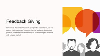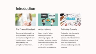 This document discusses the importance of effective feedback in personal and professional growth, emphasizing active listening, empathy, and specific, timely, and constructive feedback. It outlines best practices for giving feedback, such as preparing, focusing on behavior, and balancing praise with critique, while also addressing common challenges like delivering difficult feedback and managing power dynamics. Additionally, it provides tools and techniques like 360-degree feedback and feedback models to enhance the feedback-giving process.