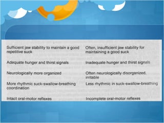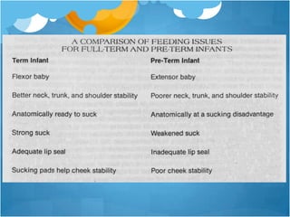 The document addresses the anatomy, physiology, and developmental skills related to feeding in infants and children, focusing on dysphagia and associated feeding problems. It outlines phases of swallowing, the importance of oral structure function, sensory processing issues, and intervention strategies for feeding difficulties. The comprehensive analysis includes assessment methods, treatment programs, and adaptations for children with various medical conditions affecting feeding, emphasizing the role of a multi-disciplinary feeding team.